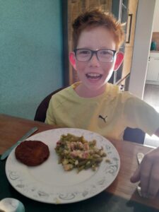 Joost maakte een overheerlijke stamppot van aardappels, spekjes en zelfgekweekte sperzieboontjes.