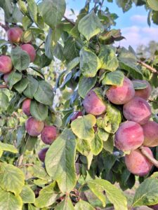 juli 2025: het was even een werkje, maar de beloning is er. Dankzij alle glitterstroken in de pruimenbomen zijn de pruimen niet voortijdig door de vogels aangepikt en rijpen ze nu af. Dat wordt smikkelen binnenkort!
