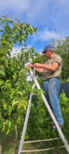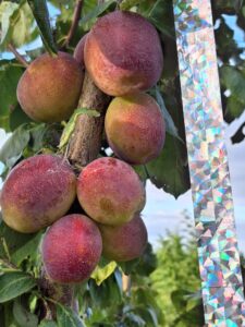 juli 2025: het was even een werkje, maar de beloning is er. Dankzij alle glitterstroken in de pruimenbomen zijn de pruimen niet voortijdig door de vogels aangepikt en rijpen ze nu af. Dat wordt smikkelen binnenkort!