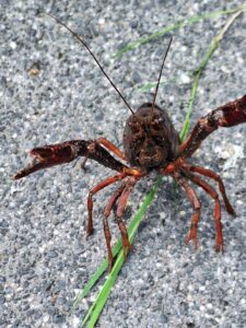 juli 2025 – Tsja, ook hier rukt de Noord-Amerikaanse rivierkreeft op. Berry is fantastisch in het bedenken van recepten van alles wat geoogst wordt op de tuin, maar deze ziet hij toch liever niet.