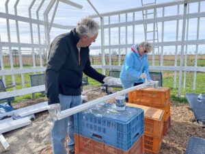 Maart 2026 – een project van driekwart jaar,… maar dan staat er ook wat: de pergola nadert haar voltooiing. Wat een werk is daar verricht door met name Berry, maar ook met hulptroepen: schilderen, zagen, boren… Nu nog de grond een steek diep ompsitten en dan allemaal klimmers planten, die straks ook nog heerlijke vruchten gaan opleveren.
