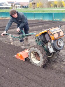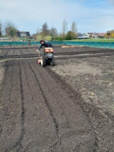 27 maart 2026 – de schooltuintjes worden vakkundig gefreesd door Arjen Smit en Teun van Duren. Bedankt heren! Het schootuinseizoen kan beginnen!